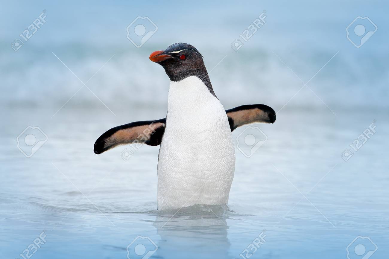 青い波の中のペンギン ロックホッパーペンギン 水鳥はフォークランドの海を泳いでいる間 青い水から飛び出します 海の中のペンギン ペンギンとのアクションウォーターシーン 南極 の写真素材 画像素材 Image